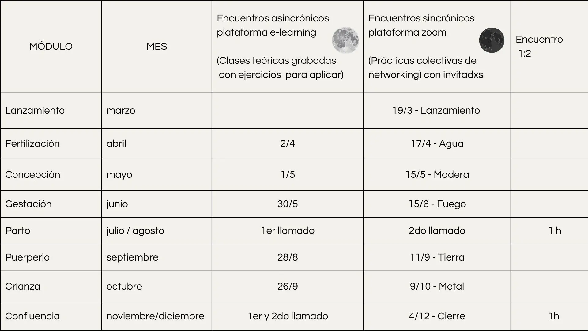 Encuentros de trabajo grupal en cada luna nueva. Respondemos consultas personales y saldamos dudas sobre el material de cada módulo.